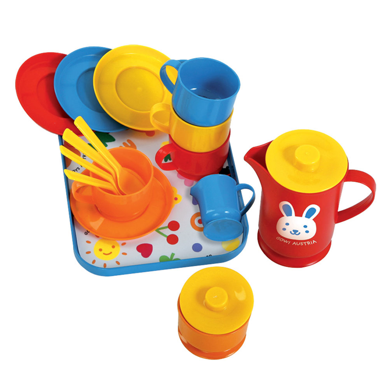 This brightly coloured set includes a coffee pot, four cups, saucers and spoons plus a milk jug and a sugar bowl, all neatly presented on a serving tray.