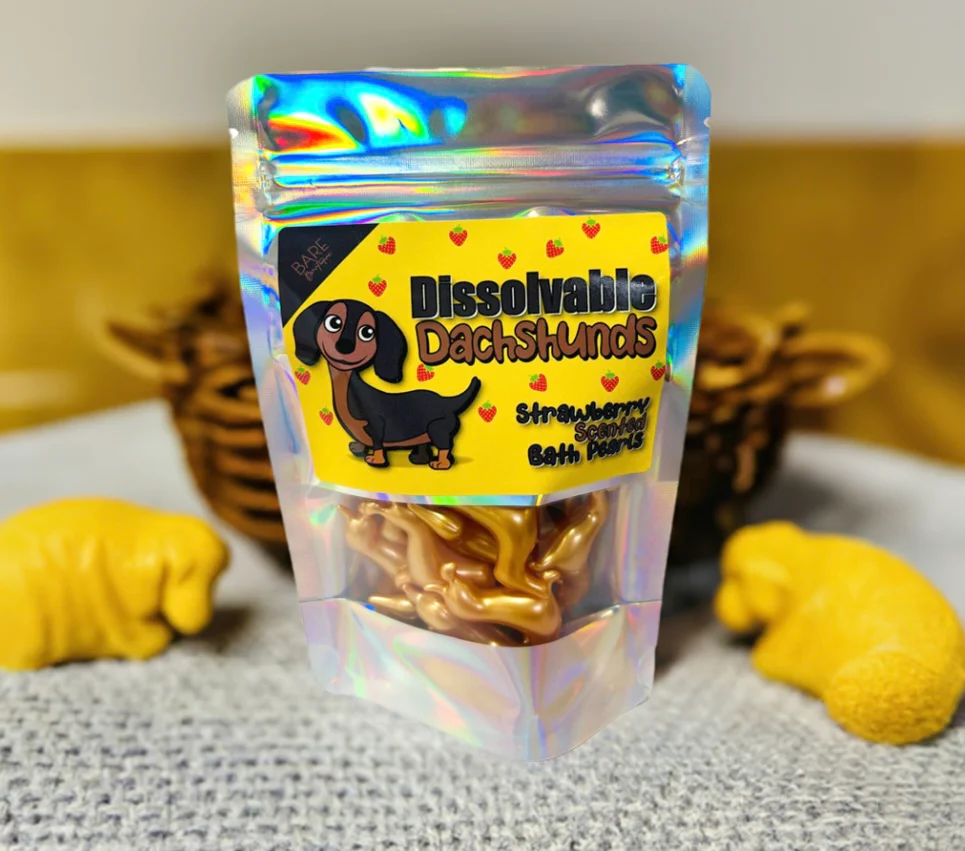 Take a trip down memory lane with our Dissolvable Dachshunds, the ultimate blend of 90’s nostalgia and self-care. These adorable, gold-colored bath pearls dissolve in warm water, releasing a sweet strawberry scent to transform your bath into a blissful retreat.