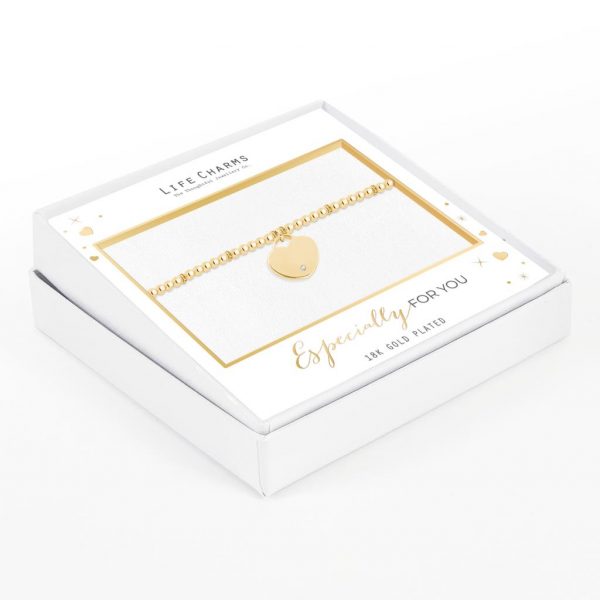 Beautiful beaded bracelet with small crystal rondelles between beads and flat heart charm crafted in gold with attention to detail and aesthetic appeal.