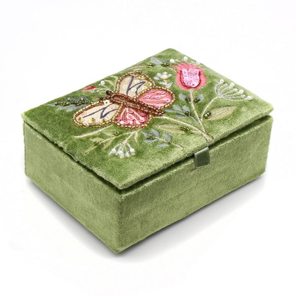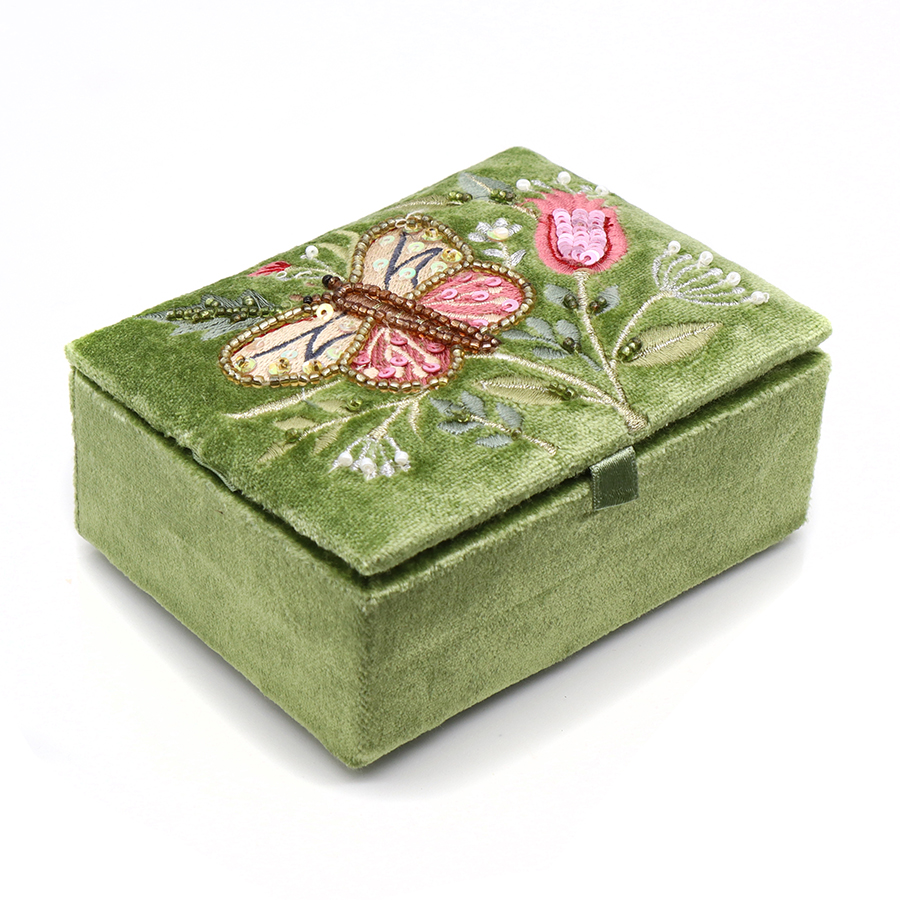 Smoky green cotton velvet jewellery box with pretty pink floral embroidery and embellished butterfly