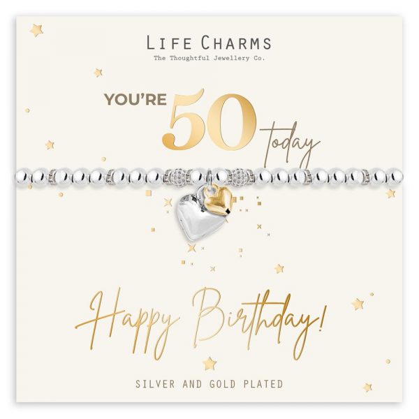 Beautiful 50th birthday silver plated bracelet with gold and silver heart charms.