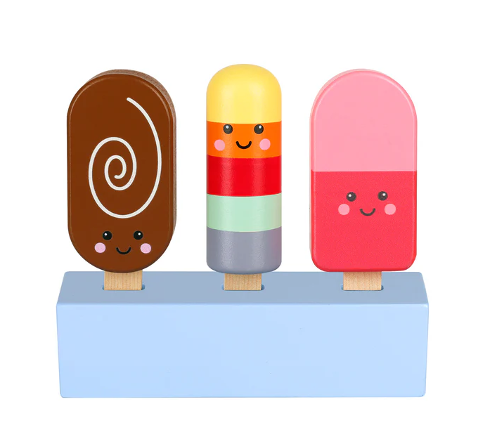 Cool down playtime with this wooden set of lollies! This charming set includes three brightly painted ice lollies & a sturdy block stand. Perfect for pretend shops, cafés, or summertime play