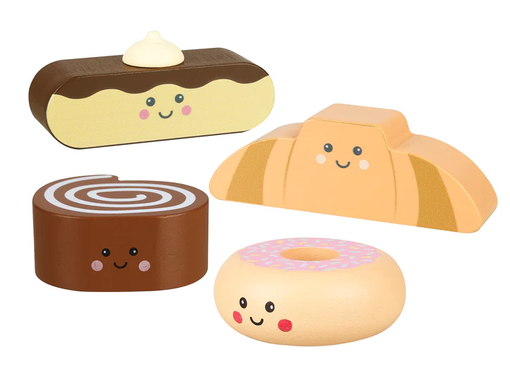 Bring the sweet treats of a bakery home with this wooden Pastry set! This delightful collection of four wooden pastries is perfect for little bakers & café owners in training