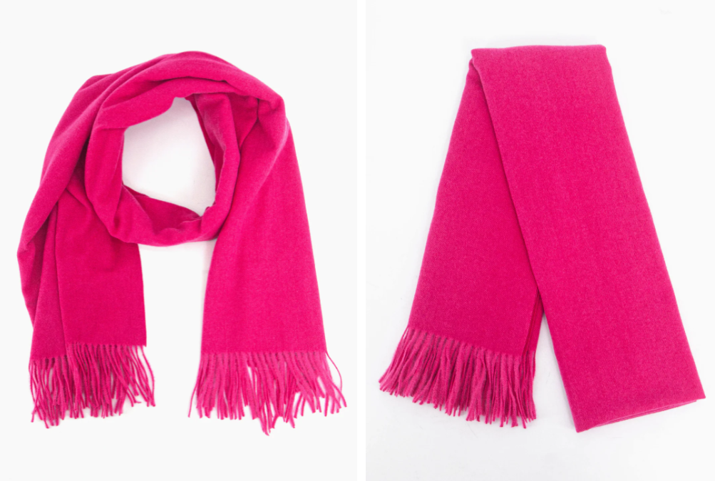A plain hot pink winter scarf, crafted from soft to the touch viscose. Designed for warmth and showcasing a bohemian influenced tasselled fringe this blanket scarf is an essential winter accessory. Effortlessly pair with outdoor winter attire.