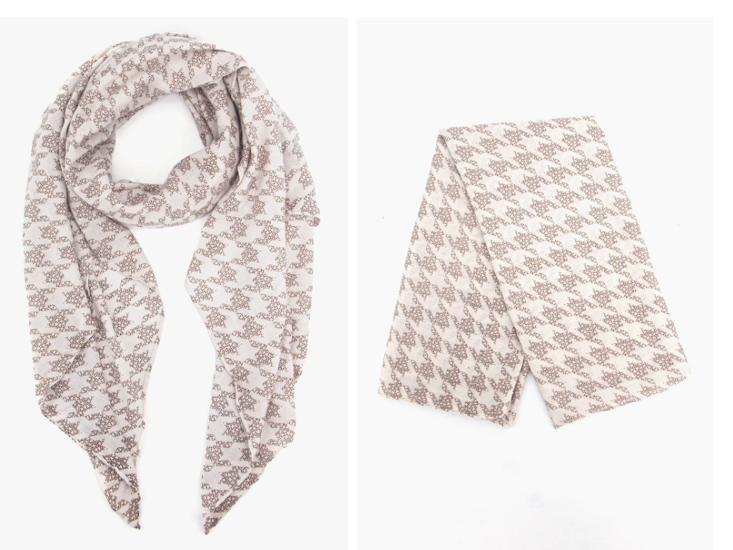 A lightweight textured scarf crafted from a soft viscose yarn. Showcasing a houndstooth pattern and subtle foil accents. A versatile transitional piece, this design can be worn as a scarf or evening wrap.
