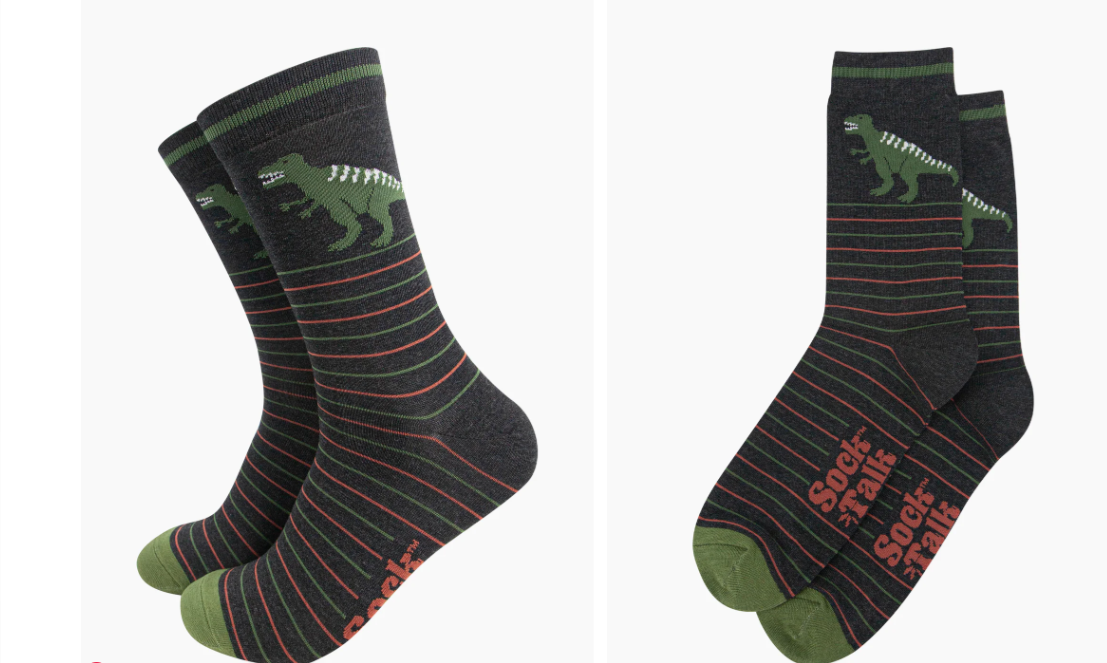 Crafted from naturally breathable bamboo these classic striped socks also feature a fierce T-rex dinosaur. These beautiful socks are eco-conscious and feel luxuriously soft. Finished with a classic striped cuff for a comfortable fit.