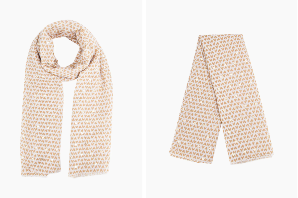 A lightweight love heart scarf featuring complementing gold foil accents. Crafted from soft viscose this piece is designed to feel luxurious. Chic and versatile this summer scarf can also be worn as an evening shawl, pashmina or beach sarong.