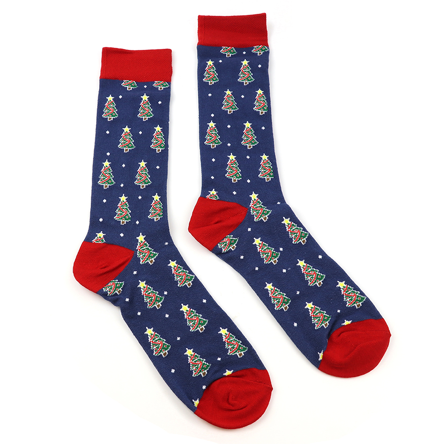 Recycled and organic yarn blend novelty gift socks for men in blue with red trim and Christmas tree themed pattern