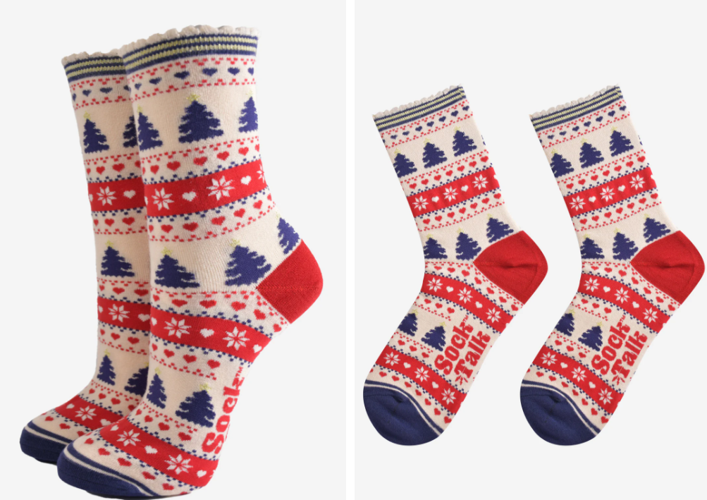 Designed in the UK, these Fair Isle inspired Christmas socks are crafted from naturally breathable bamboo. Showcasing Christmas trees, snowflakes and red love hearts. These festive socks are eco-conscious and feel luxuriously soft.