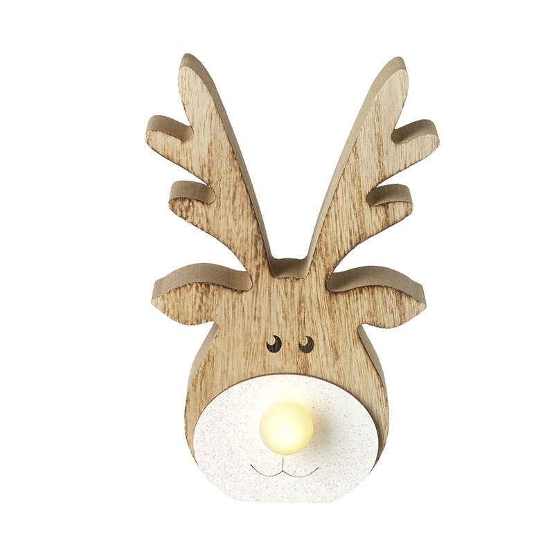 Wooden deer ornament with a white light up nose.